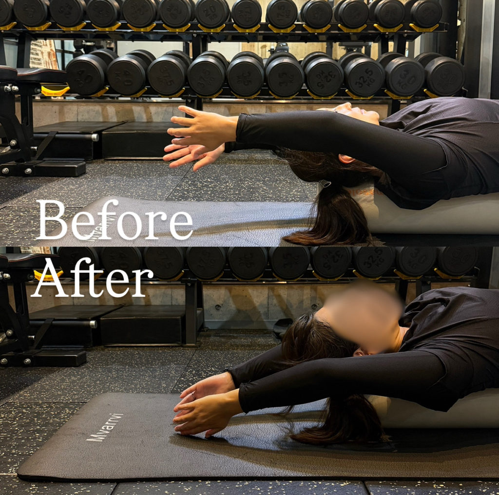 写真を見ていただくと分かるように、ストレッチポールを使ったコンディショニングだけで、腕の上がり方に変化が出ています🙌✨